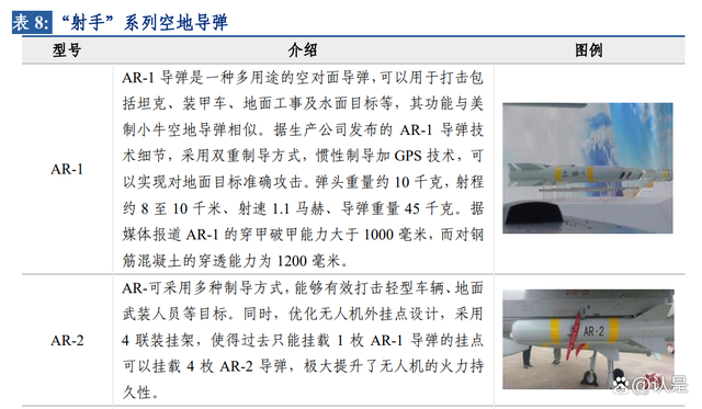 除了整机研发,公司还同步研制用于配装彩虹无人机的射手系列空地导弹机载武器,通过有效发挥系统集成优势,能够发挥出无人机和弹药的最大协同效能,无人机可为智能弹药研制提供飞行验证平台,弹药的大量应用亦可快速提升无人机的改进研制和性能提升,公司自主研制的 AR-1、AR-2“射手”系列空地导弹因其极高的性价比,在国际军售市场上受到海外多个国家大量采购,同时公司还在继续研制改进以 AR 系列为基础的 80 公斤级 AR-4 空地导弹。