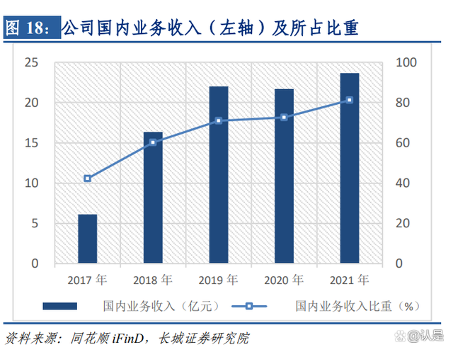 2021 年,航天彩虹公司国内、国外营业收入分别为 23.66、5.48 亿元,国内外业分别务占比 81.2%、18.8%。2017-2021 年,国内业务收入占总营业收入比重由 2017 年的 42.28%逐年提高至 81.2%,国外业务收入占比由 2017 年的 57.72%逐年降低至 18.8%。根据投资者关系管理档案,2020 年公司无人机业务的国内/国外收入比约为 1:1,2021 年这个比例变成了近 5:2,反映了 2021 年国内需求的快速增长。国内外业务毛利率的变化同样也进一步证明公司调整海内外产品销售模式的明智之举:虽然国外业务毛利率在 2017-2021 年一直高于国内业务,但国内业务的毛利率由 2018 年的 18.12%提升至 2021 年的 21.15%,呈上升趋势,而国外业务毛利率呈下降趋势,公司提前布局海内外业务结构有利于长期经营状况的改善。