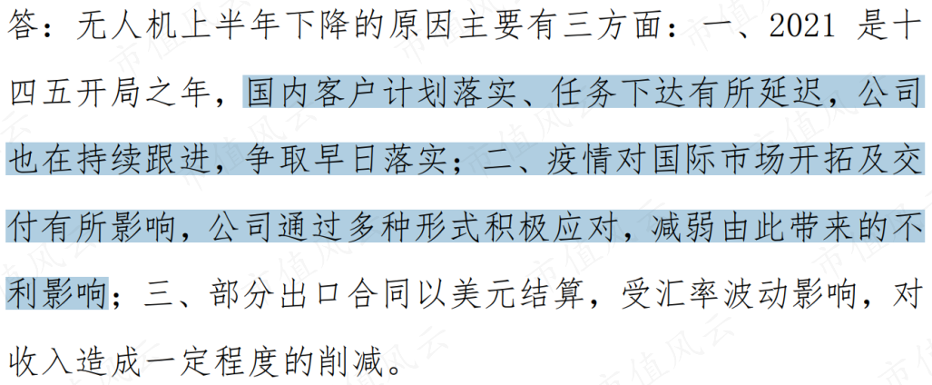 2021年由于是十四五开局之年,国内无人机采购计划有所延迟,进入2022年,预计公司的无人机业务正取得改善。