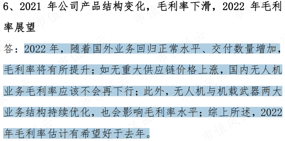 公司预计:2022年国外业务回归正常、交付量增加,毛利率将有所提升;国内无人机毛利率在无重大供应链价格上涨的前提下,应该也不会再下行,公司无人机业务的毛利率有望好于2021年。