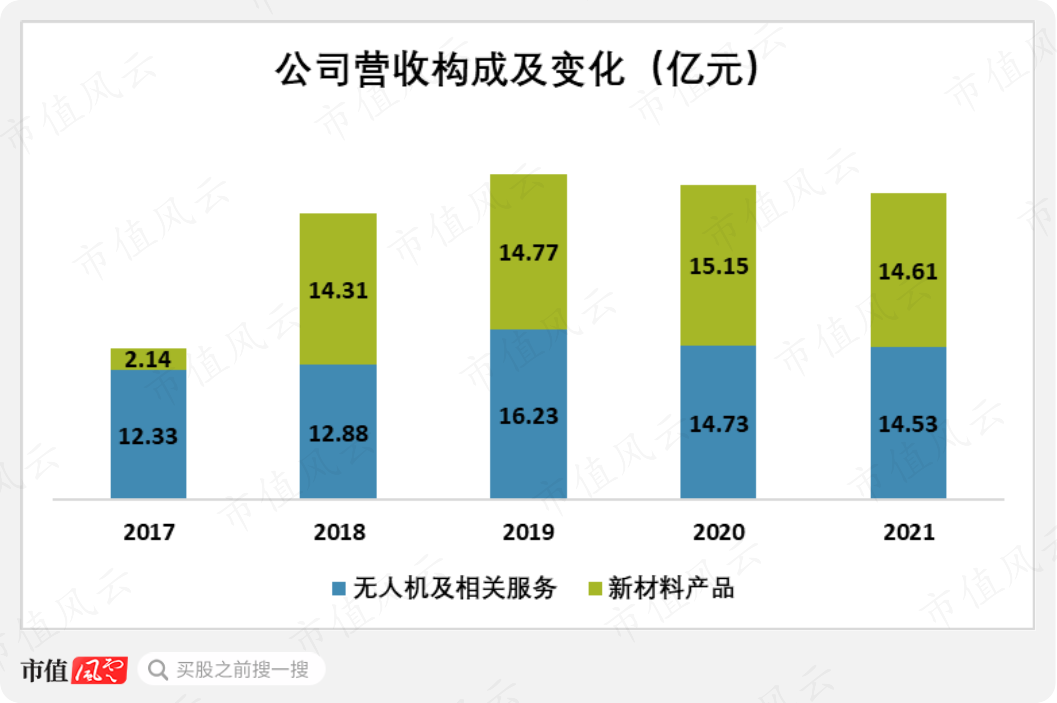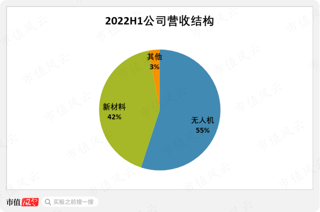 目前公司拥有特种飞行器(即无人机)和新材料两大主业,2022H1,无人机贡献的收入占比为55%,新材料收入占比为42%,公司的新材料产品主要是功能聚酯薄膜、光伏背材基膜、光学薄膜等。