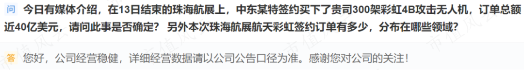 有媒体报道,此次珠海航展上沙特采购的300架无人机是彩虹-4B察打一体无人机,该消息未经公司证实。