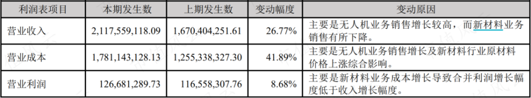 公司解释称,营收的增长主要得益于无人机业务销售增长较高,但由于新材料业务销售有所下降,以及原材料价格上涨的综合影响,导致合并利润增幅低于收入增幅。
