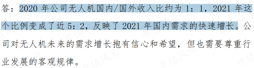 2021年公司加大了国内市场拓展,成功进入“国内某领域”,使得国内收入与国外收入的比例达到近5:2,从而导致无人机毛利率出现下降。