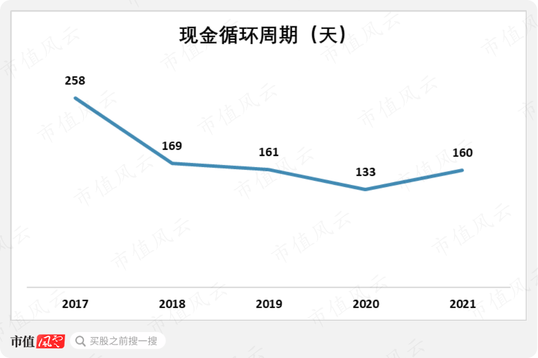 2017年以来,公司的现金循环周期改善明显,一轮完整的购存销所用时间由258天缩短至2021年的160天,显示公司的资金利用效率有了大幅提高。