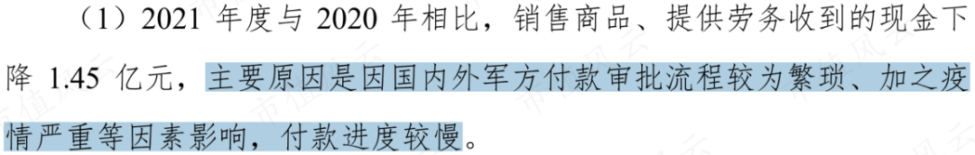 现金流方面,2021年受国内外军方付款进度较慢、备货增加等因素影响,公司的经营性现金净流入大幅减少。