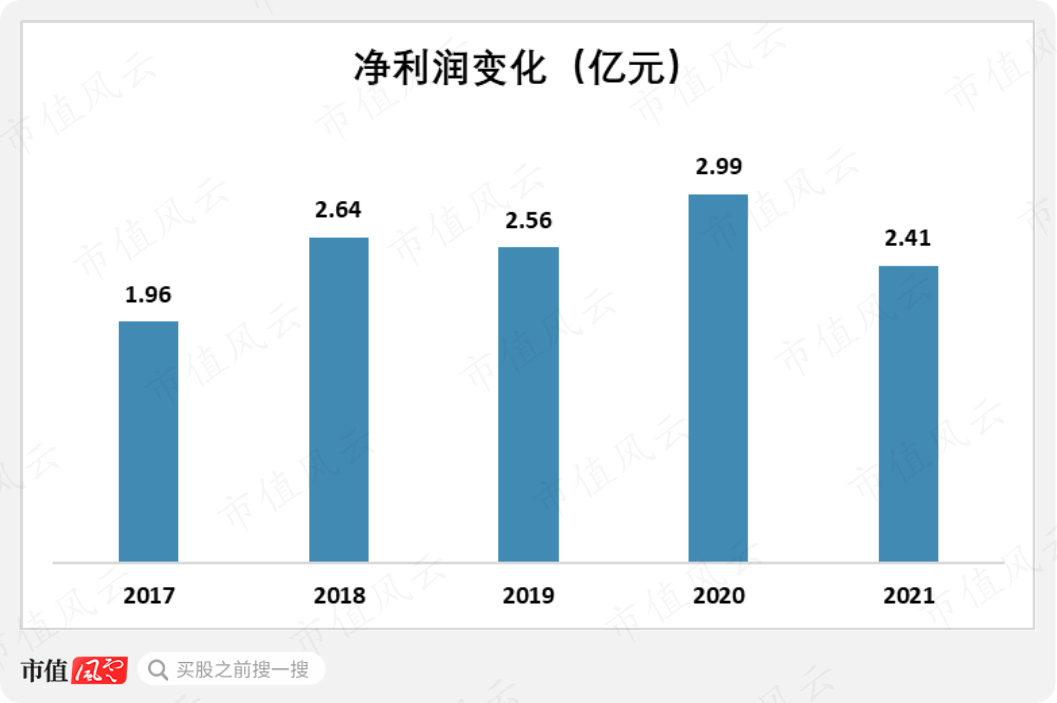 公司利润端的变化趋势与收入端一致,2017-2020年,净利润整体保持增长,2021年主要受收入规模下降影响,净利润同比减少19%至2.4亿元。