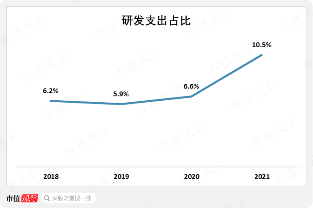 以研发支出占营收的比例来衡量公司的研发投入强度,则2021年受研发项目增多影响,公司的研发支出占营收的比重达到10.5%,较2020年提高了4个百分点。