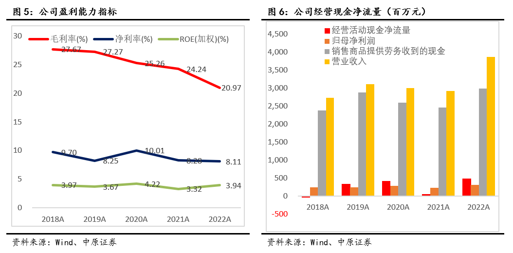 公司2022年毛利率20.97%,同比下降了3.27个百分点;净利率8.11%,同比下降0.17个百分点;加权ROE为3.94%,同比上升0.62个百分点。公司毛利率波动主要原因是产品结构变化导致,无人机业务增长121.27%,毛利率提升5.77个百分点,但电子元器件业务毛利率大幅下滑,拖累公司整体毛利率。