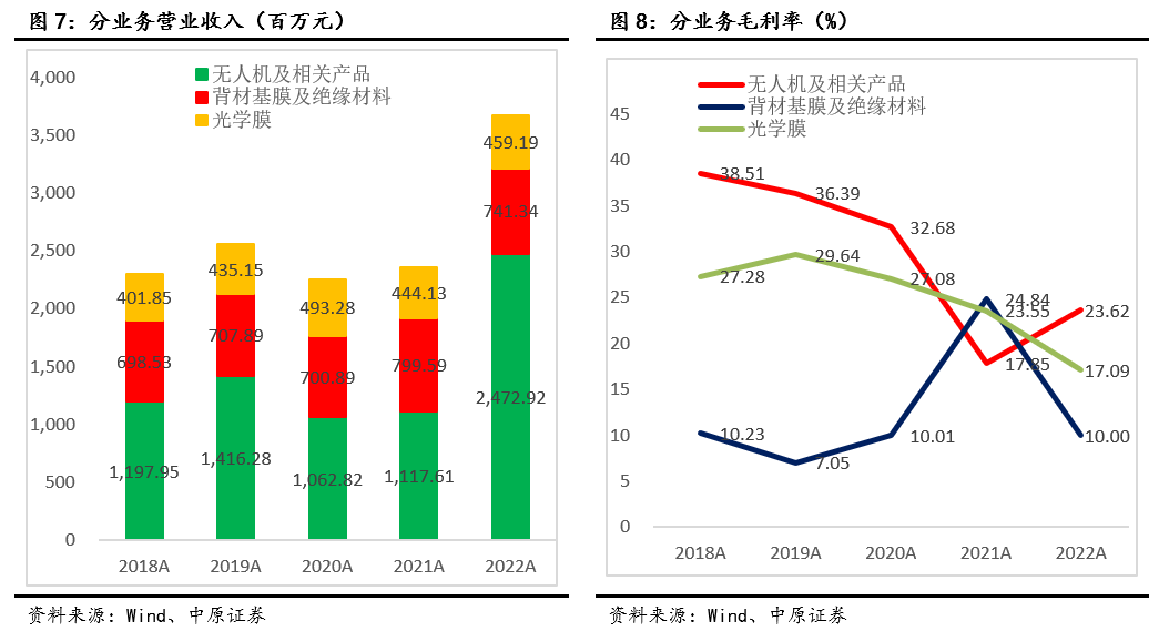 分产品看,2022年无人机毛利率23.62%,提升5.77个百分点;背材膜及绝缘材料毛利率10%,下滑14.84个百分点;光学膜毛利率17.09%,下滑6.46个百分点。公司核心业务无人机营业收入和毛利率快速提升,未来毛利率有望持续改善。