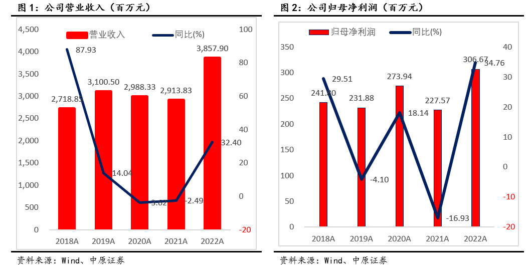 公司2022年报业绩较为靓丽。营业收入38.58亿,同比增长32.5%,归母净利润3.07亿,同比增长34.8%,扣非净利润2.7亿,同比增长55.45%。2022年分业务看:
