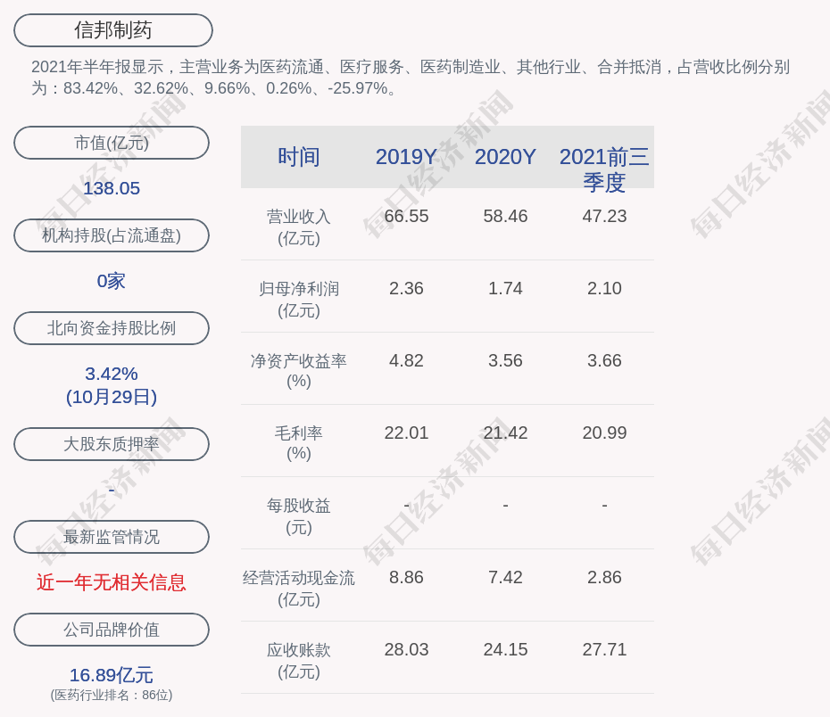 2021年半年报显示,信邦制药的主营业务为医药流通、医疗服务、医药制造业、其他行业、合并抵消,占营收比例分别为:83.42%、32.62%、9.66%、0.26%、-25.97%。