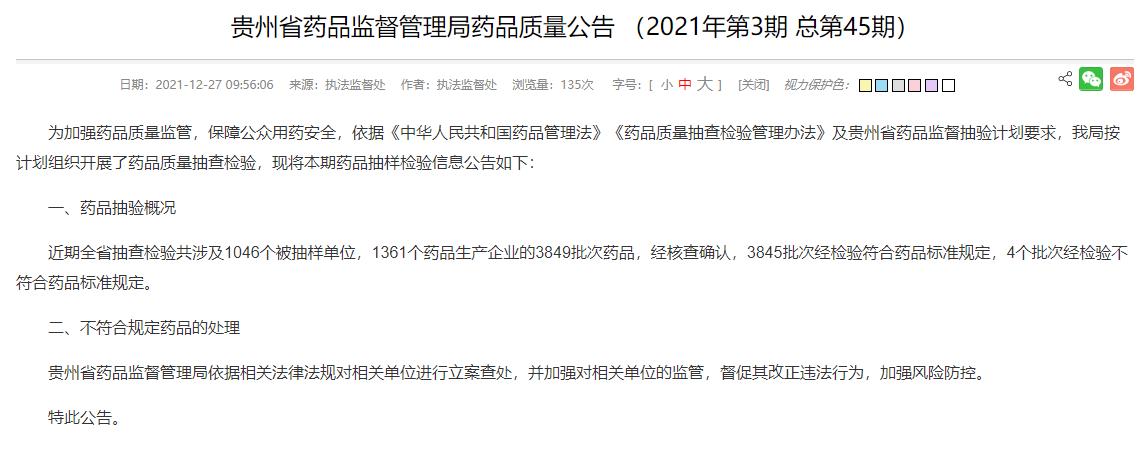 近期贵州全省抽查检验共涉及1046个被抽样单位,1361个药品生产企业的3849批次药品,经核查确认,3845批次经检验符合药品标准规定,4个批次经检验不符合药品标准规定。贵州省药品监督管理局依据相关法律法规对相关单位进行立案查处,并加强对相关单位的监管,督促其改正违法行为,加强风险防控。