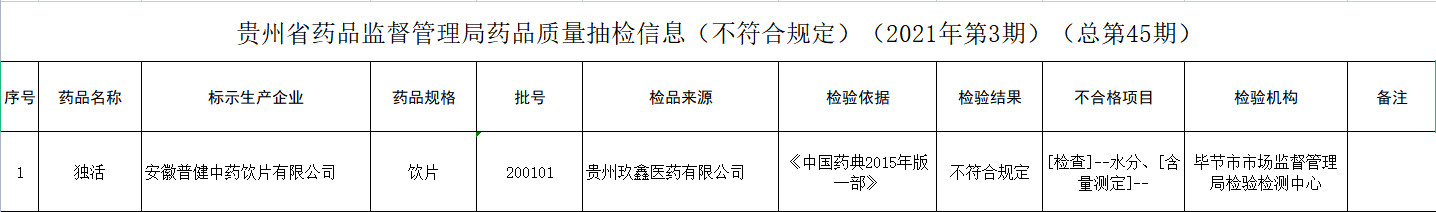 标示由安徽普健中药饮片有限公司生产的独活(饮片)检验发现不符合规定,不合格项目为[检查]--水分、[含量测定],产品批号为200101,检品来源为贵州玖鑫医药有限公司,检验机构为毕节市市场监督管理局检验检测中心。