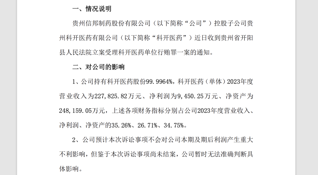 此前, 信邦制药 曾于今年3月公告,公司控股子公司 贵州科开医药有限公司 (以下简称“科开医药”)收到 贵州省开阳县人民法院 立案受理科开医药单位行贿罪一案的通知。