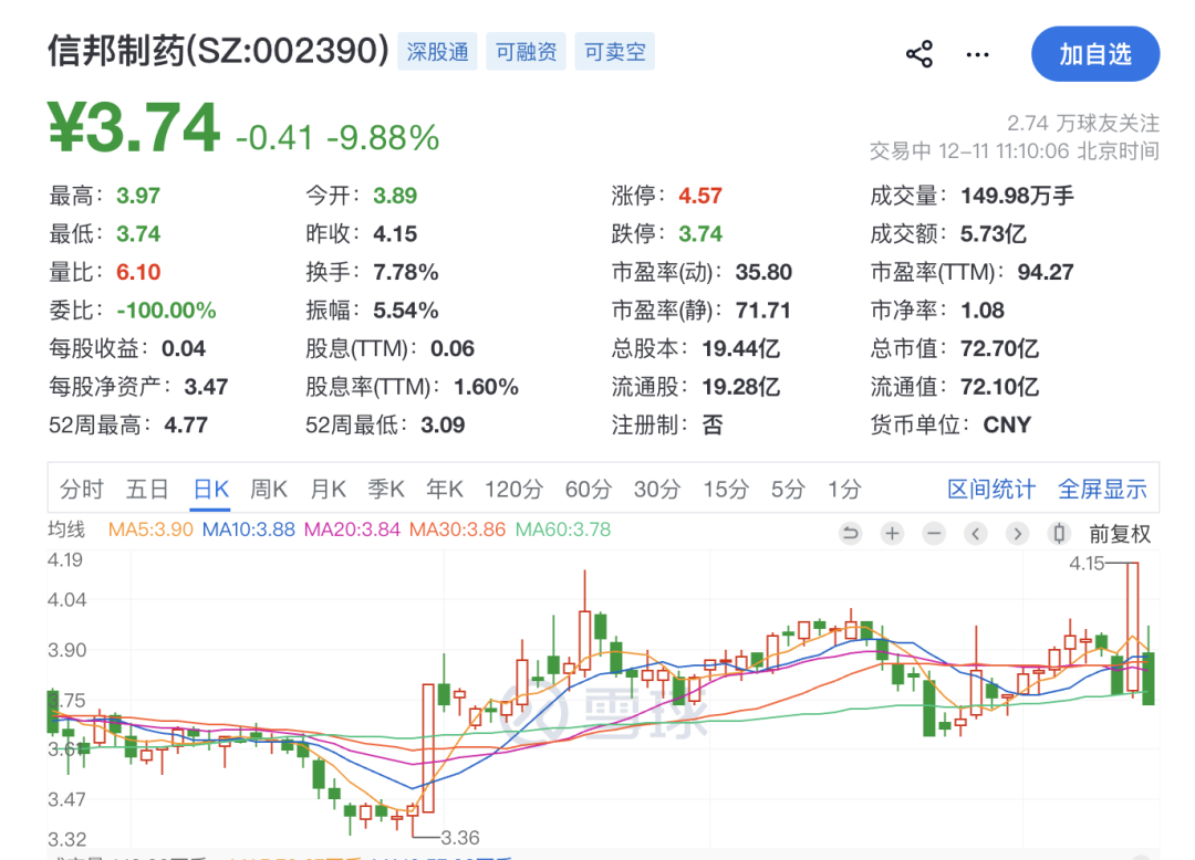 值得注意的是,盘面上,12月10日,临近收盘时, 信邦制药 股价突然异动拉升,并迅速封至涨停。截至当日收盘,公司股价为4.15元/股,总市值为80.67亿元。