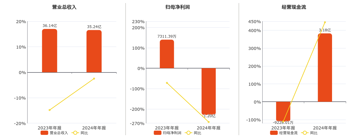 公司营业总收入为35.24亿元,较去年同报告期营业总收入减少9011.76万元,同比较去年同期下降2.49%。归母净利润为-1.20亿元,较去年同报告期归母净利润减少1.93亿元,同比较去年同期下降264.06%。经营活动现金净流入为3.18亿元。