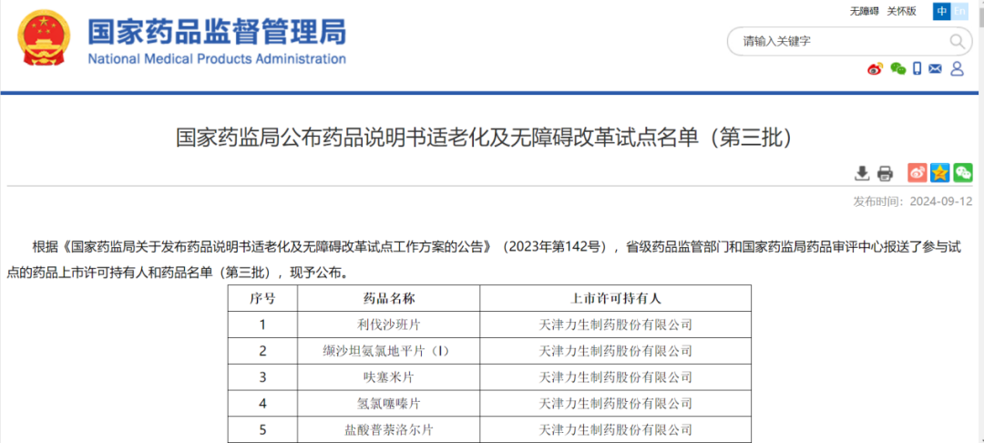 随着《国家药监局关于发布药品说明书老化及无障碍改革试点工作方案》的发布,天津力生制药股份有限公司紧跟改革步伐,成功入选国家药品监督管理局公布的“药品说明书适老化及无障碍改革试点名单(第三批)”,12月17日公司第一个试点品种呋塞米片的简化版说明书通过天津市药品监督管理局批准,成为天津市第一个使用简化版说明书的品种。