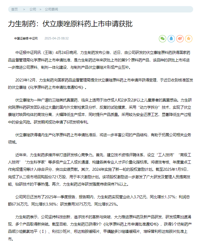 4月25日,《中国证券报》刊发《力生制药:伏立康唑上市申请获批》,该品种的获批上市将进一步推进公司原料、制剂一体化建设,与制剂产品伏立康唑片形成产业互补。