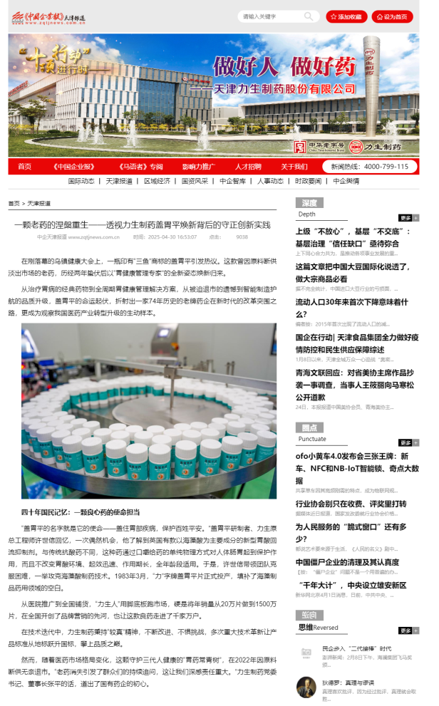 近日,中国企业报刊登《一颗老药的涅槃重生——透视力生制药盖胃平焕新背后的守正创新实践》。以盖胃平的命运起伏折射出了力生制药一家74年历史的老牌药企在新时代的改革突围之路。