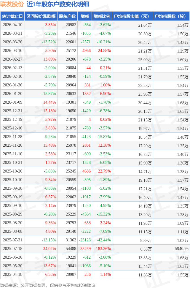 从股价来看,2026年3月31日至2026年4月10日,联发股份区间涨幅为3.85%,在此期间股东户数减少564.0户,减幅为2.62%。