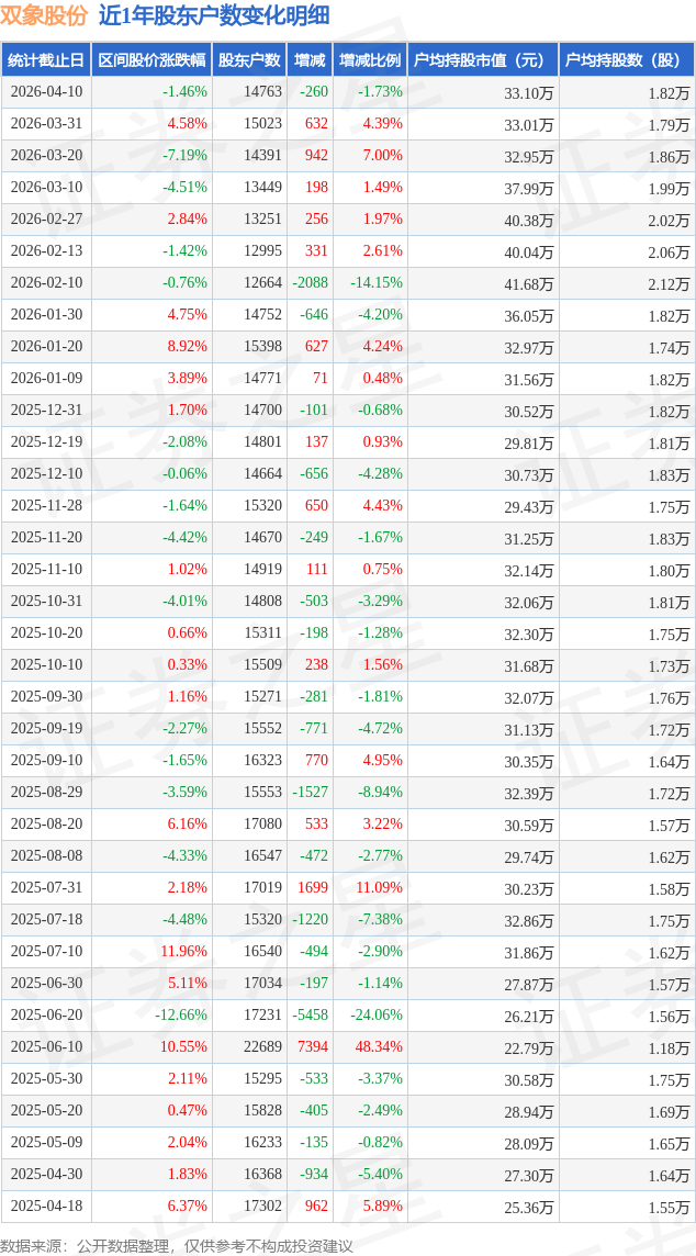 近日双象股份披露,截至2026年4月10日公司股东户数为1.48万户,较3月31日减少260.0户,减幅为1.73%。户均持股数量由上期的1.79万股增加至1.82万股,户均持股市值为33.1万元。