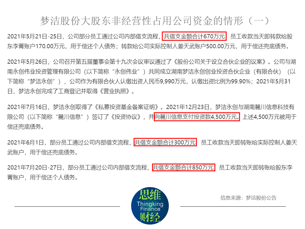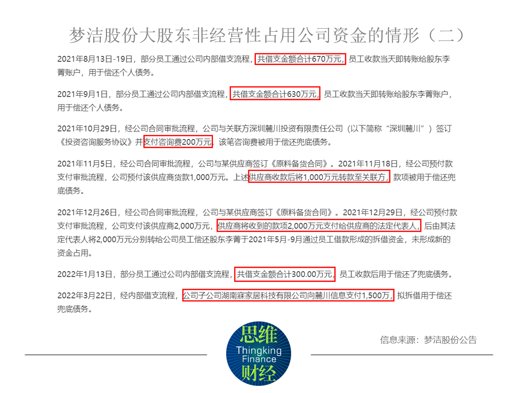 根据梦洁股份2021年年报所披露的信息来看,该公司实控人姜天武及其他关联方存在非经营性占用公司资金的行为,到去年年底合计占用资金超过8000万,且资金均用于偿还共同或个人债务。
