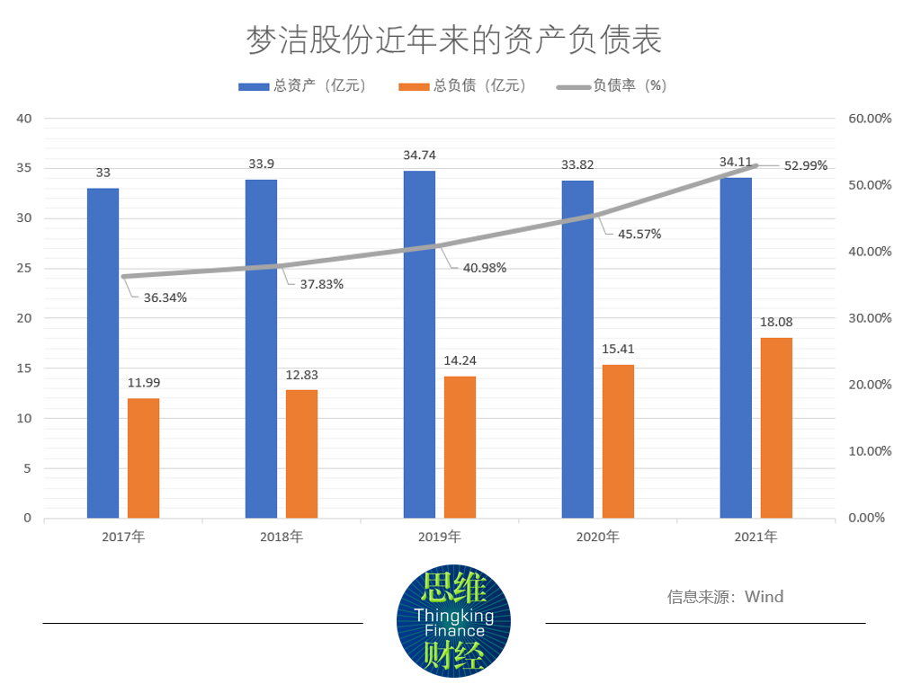 而在梦洁股份业绩持续下滑的同时,其负债率却攀升到五年来的最新高。负债方面,2017年-2021年,梦洁股份资产负债分别约为12亿元、12.8亿元、14亿元、15亿元和18亿元;负债率分别为36%、38%、41%、46%、53%。