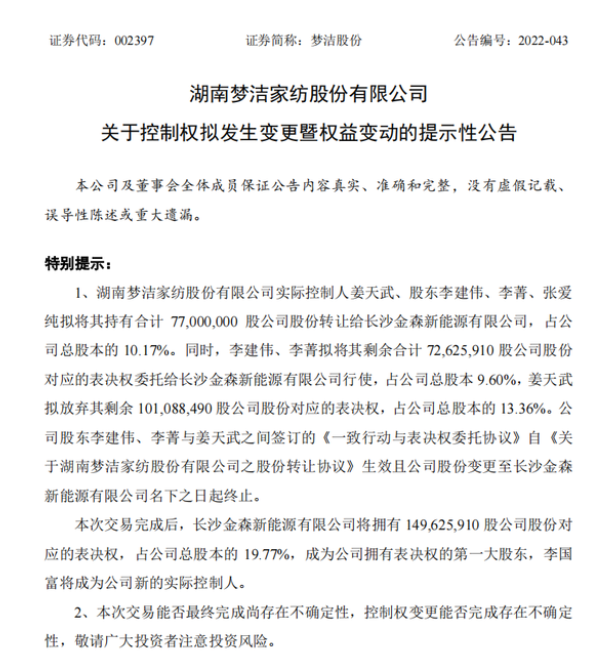 《快消品》从公告中了解到,实控人姜天武、股东李建伟、李菁、张爱纯拟转让股权,并委托表决权,导致公司控制权将发生变更,交易完成后,长沙金森新能源有限公司将拥有1.50亿股上市公司股份对应的表决权,占公司总股本的19.77%,成为公司拥有表决权的第一大股东,金森新能源的控股股东李国富将成为梦洁股份新的实际控制人。