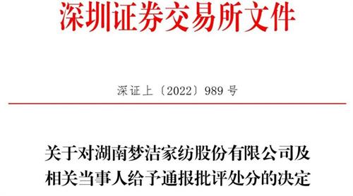 对此,深交所决定对梦洁股份以及姜天武、黄惠华(梦洁股份时任总经理)、李云龙(梦洁股份财务总监)、李菁、李建伟、李军、张爱纯给予通报批评的处分。