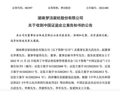 11月23日晚间,梦洁股份(002397.SZ)发布公告称,公司及董事长姜天武、副董事长李菁、董事李建伟、董事会秘书李军、股东张爱纯于2022年11月22日收到中国证监会《立案告知书》,因涉嫌信息披露违法违规,根据《中华人民共和国证券法》《中华人民共和国行政处罚法》等法律法规,中国证监会决定对公司及姜天武、李菁、李建伟、李军、张爱纯立案。
