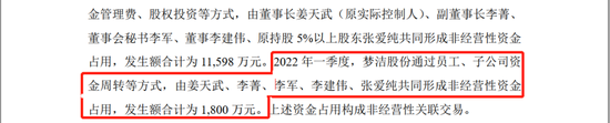 公告显示,2021年度和2022年一季度,梦洁股份通过员工、子公司资金周转等方式,由姜天武、李菁、李军、李建伟、张爱纯共同形成非经营性资金占用,发生额分别为11,598万元和1,800万元。