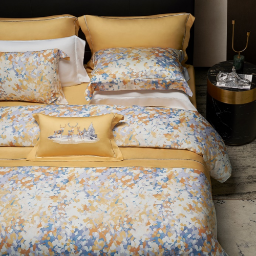 梦洁股份的天丝印花套件,面料选用的是被称作“21世纪的绿色纤维”——100%奥地利进口兰精天丝,兼具棉的舒适与真丝的丝滑垂感,不但耐洗经用,易于打理,还不易起球。同时,由于南方的春季多雨,不少人家里的床品总是潮湿,盖在身上倍感粘腻,而天丝的吸水性是棉的1.5倍,能整晚保持清爽,不会让人感到沉闷。