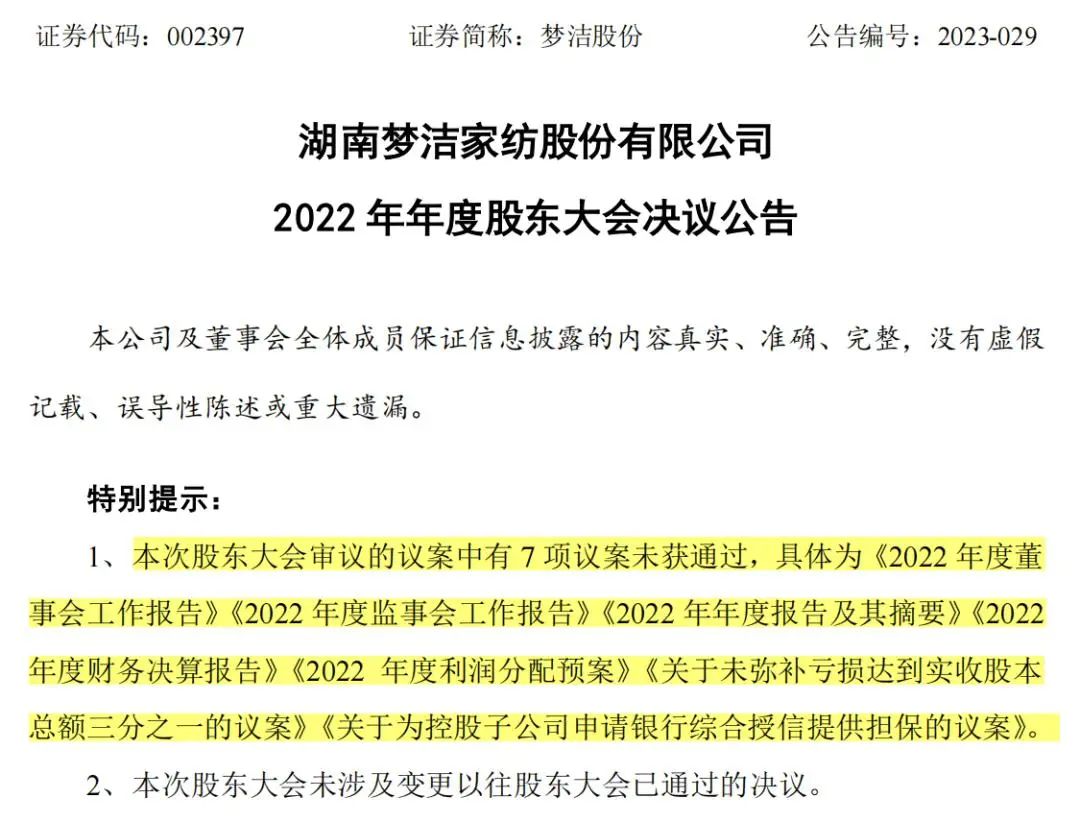 近日,梦洁股份(002397.SZ)年度股东大会议案表决结果显示,在审议的8项议案中,《2022年度董事会工作报告》等7项议案均未获通过,主要原因是公司实控人长沙金森新能源有限公司对上述议案投了弃权票或反对票。