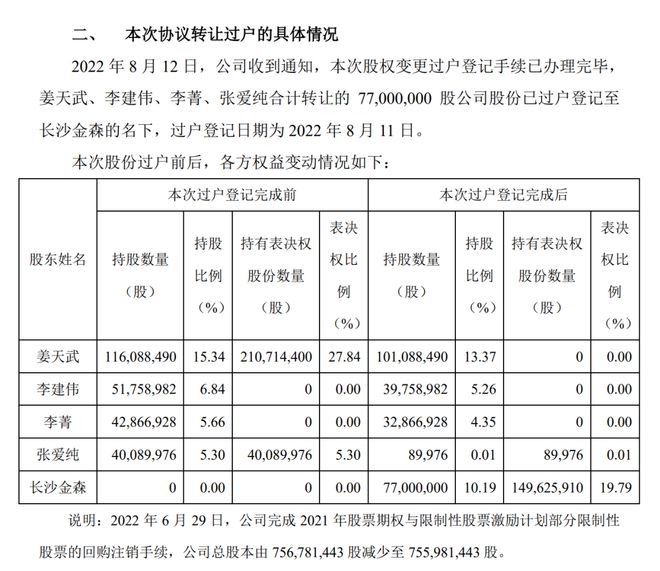违规行为暴露后,姜天武及其一致行动人已于2022年4月归还了占用全部资金的本金及利息。但巨债仍压在头上,5人这才找到长沙金森,通过转让股权回笼资金3.85亿元,再加上此前减持,偿还兜底债务已经绰绰有余。
