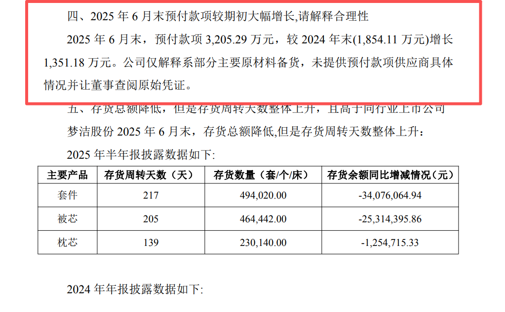 2025年6月末,预付款项3,205.29万元,较2024年末(1,854.11万元)增长1,351.18万元。公司仅解释系部分主要原材料备货,未提供预付款项供应商具体情况并让董事查阅原始凭证。