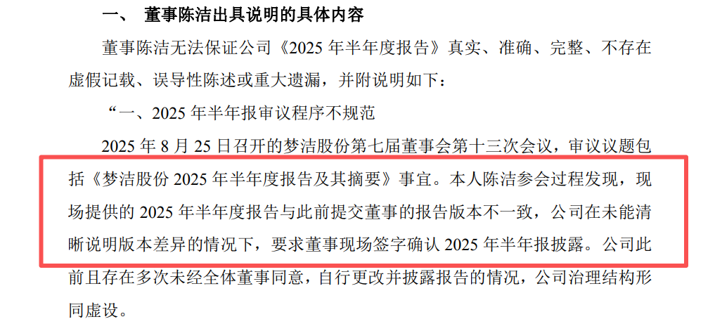 根据董事陈洁出具的说明,“本人陈洁参会过程发现,现场提供的2025年半年度报告与此前提交董事的报告版本不一致,公司在未能清晰说明版本差异的情况下,要求董事现场签字确认2025年半年报披露。公司此前且存在多次未经全体董事同意,自行更改并披露报告的情况,公司治理结构形同虚设。”