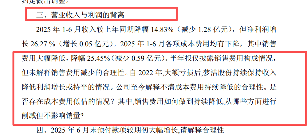 陈洁指出,营业收入与利润的背离。“2025年1-6月收入较上年同期降幅14.83%(减少1.28亿元),但净利润增长26.27%(增长0.05亿元)。2025年1-6月各项成本费用均有下降,其中销售费用大幅降低,降幅25.45%(减少0.59亿元)。半年报仅披露销售费用构成情况,但未解释销售费用减少的合理性。自2022年,大额亏损后,梦洁股份持续保持收入降低利润增长或持平的情况。公司至今解释不清成本费用持续降低的合理性。是否存在成本费用低估的情况?其中,销售费用如何做到持续降低,从哪些方面进行削减但不影响销量?”