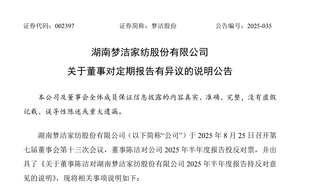 乐居财经李兰 8月26日,梦洁股份(002397.SZ)发布2025年半年度报告,营收出现下滑。同日,公司发布关于董事对定期报告有异议的说明公告。