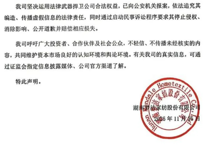 11月25日, 梦洁股份 发布严正声明,称陈洁相关言论均为“主观臆断与恶意捏造”,与公司实际经营情况、内部管理流程及高管履职行为严重不符,并表示已向GA机关报案。