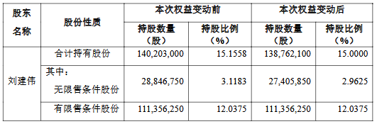 本次减持前,刘建伟合计持有公司股份140,203,000股,占公司总股本比例15.1558%,其中无限售条件股份28,846,750股,占公司总股本比例3.1183%;有限售条件股份111,356,250股,占公司总股本比例12.0375%。减持后,刘建伟持有公司股份138,762,100股,占公司总股本比例15.0000%,持股比例触及5%的整数倍。其中无限售条件股份27,405,850股,占公司总股本比例2.9625%;有限售条件股份111,356,250股,占公司总股本比例12.0375%。
