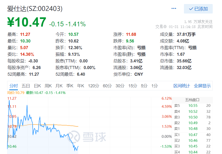 1月31日,截至11:14,爱仕达(002403.SZ)股价跌1.41%,报10.47元,总市值为35.66亿元。