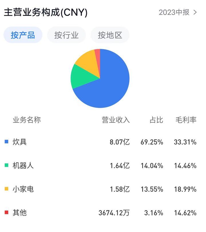 在2023年中报中,机器人创收排在第二位,为1.64亿元,营收占比14.04%;与创收主力炊具相差甚远,与小家电占比接近,但毛利率没有小家电高,为14.46%。最近几年,爱仕达净利持续下滑,这与主营业务小家电创收下滑有一定关系。数据显示,2021年小家电营收为4.3亿,机器人为2.51亿;2022年小家电营收为3.7亿,机器人为3.55亿。