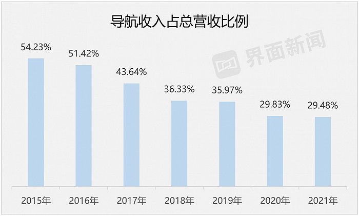 相对应,导航业务占比逐年降低,已经不是其最大比例的收入来源。2016年之前导航收入占营业收入比例超过50%,到2020年时已经低于30%,2021年为29.48%。