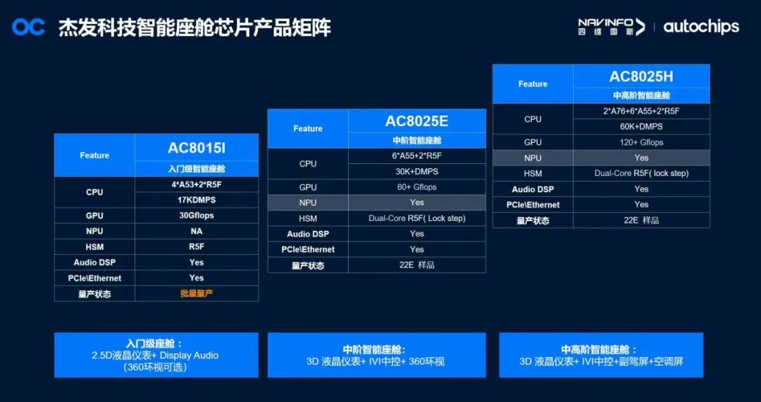 基于对“智能座舱的核心是芯片平台”的深刻理解,杰发科技智能座舱芯片从入门级AC8015I(2.5D液晶仪表+Display Audio)、中阶级AC8025E(3D液晶仪表+IVI中控+360环视),到中高阶级AC8025H(3D液晶仪表+IVI中控+副驾屏+空调屏),可完全满足多样化的市场需求,覆盖从入门到中高端多种车型,可以给客户提供多样化选择。