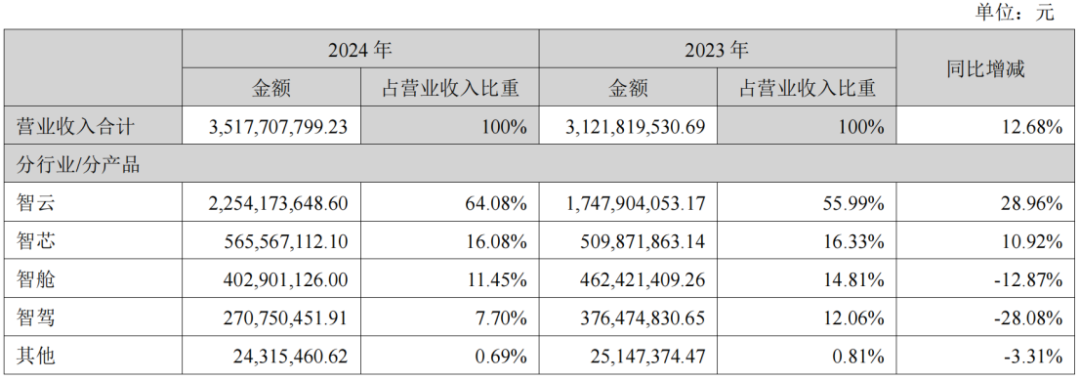 2024年,智云业务收入为22.54亿元,同比增长28.96%,是五大业务板块中同比增速最高的业务板块,同时该业务收入占总营收的比例由2023年的55.99%进一步提升至64.08%。