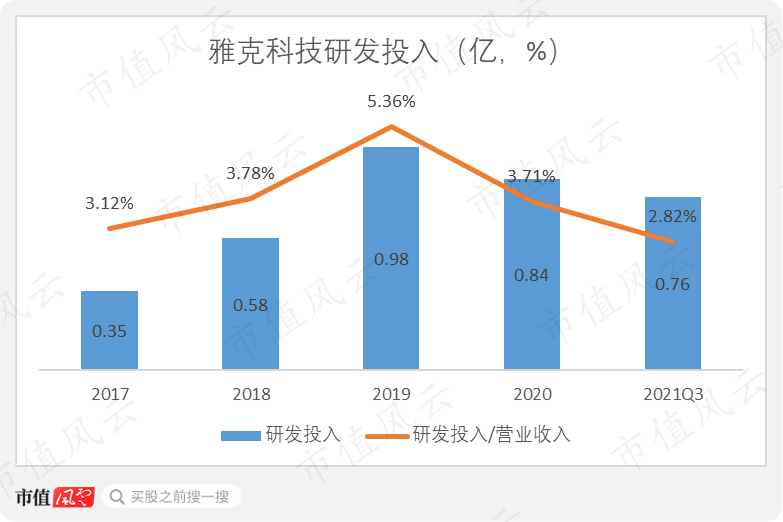 但如我们所知,雅克科技的电子材料业务全是对外并购取得的,并最终形成18亿商誉。2020年,公司研发投入0.84亿,占总营收的3.71%,后续研发投入也不算高。