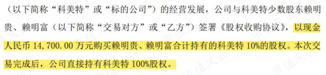 2020年5月26日,雅克科技又以1.47亿向赖老板收购了成都科美特剩余的10%股权,成都科美特也成为了上市公司的全资子公司。
