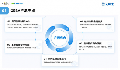 工欲善其事,必先利其器。作为一家数字化软件企业,在投标领域,广联达致力于打造便捷化工具,让投标舒心、放心、安心、省心。借助本次赋能大会,广联达重磅发布了投标服务GEBA产品。产品围绕施工企业投标全过程,重点针对用户寻找投标底稿时间长、资信文件管理成本高、政策法规查找慢、模拟报价效率低、投标工具分散使用等问题,提供文件库、资信库、知识库、模拟报价、工具箱等五大功能,以一站式解决方案,提高企业投标效率。