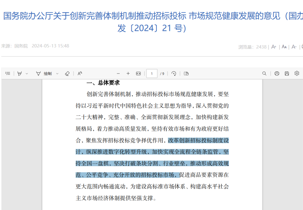 国务院办公厅关于《创新完善体制机制推动招标投标市场规范健康发展的意见》支持推进招投标数字化转型升级,推动高效公平开放的招投标市场环境。